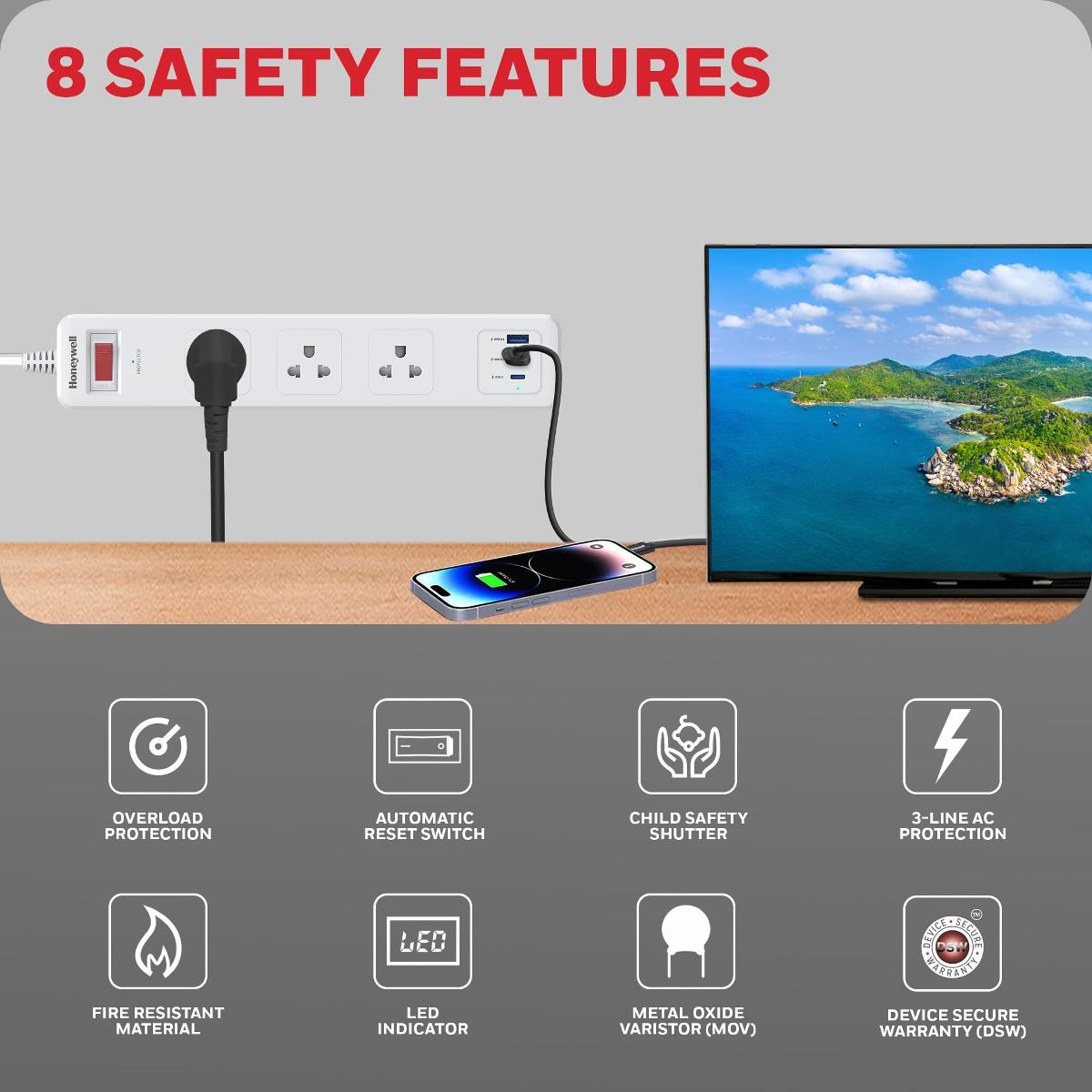 • 8 คุณสมบัติความปลอดภัยขั้นสูง ด้วย ระบบการป้องกันไฟเกิน, ระบบสวิตช์ควบคุมรีเซ็ตอัตโนมัติ, ระบบชัตเตอร์นิรภัยสำหรับป้องกันความปลอดภัยของเด็ก, วัสดุทนทานต่อความร้อน และไฟได้เป็นอย่างดี, ระบบไฟแสดงสถานะ LED สำหรับการป้องกันไฟกระชาก, ระบบการป้องกันไฟฟ้ากระแสสลับแบบ 3 สาย, ระบบ MOV ช่วยป้องกัน และควบคุมไฟฟ้า, การรับประกันความปลอดภัย DSW ด้วยวงเงินสูงสุด 7,500 เหรียญสหรัฐ