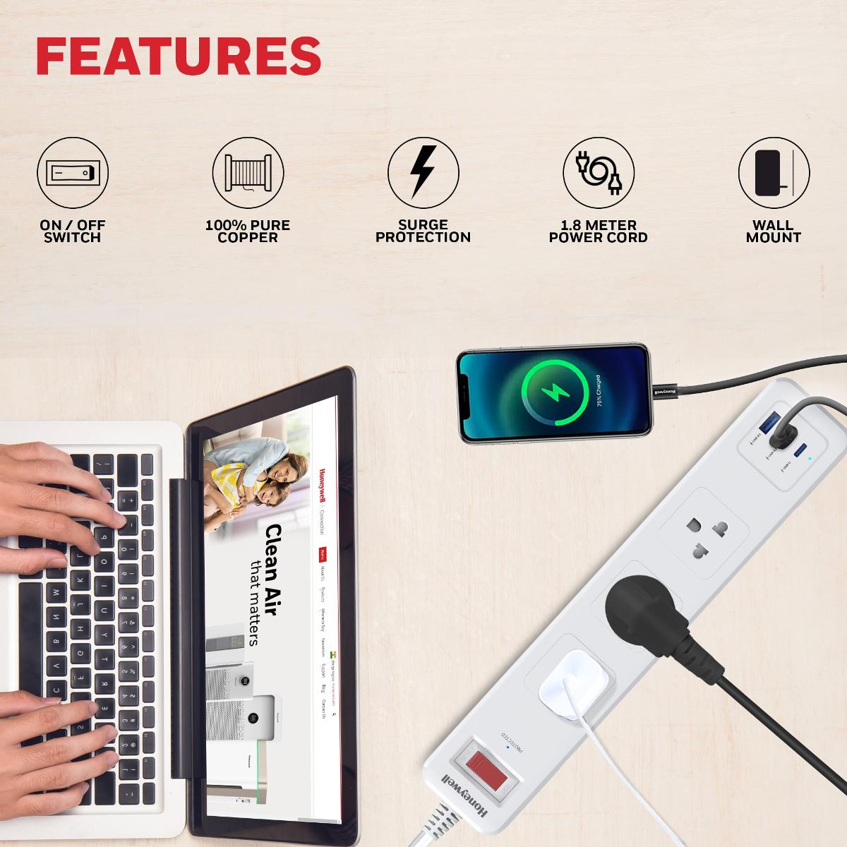 ปลั๊กไฟ 3 ช่อง Honeywell 3 Outlet Surge Protector with 1xType C & 2xUSB HC000038/SRG/1.8M/WHT/3/2U/PD20W/TH