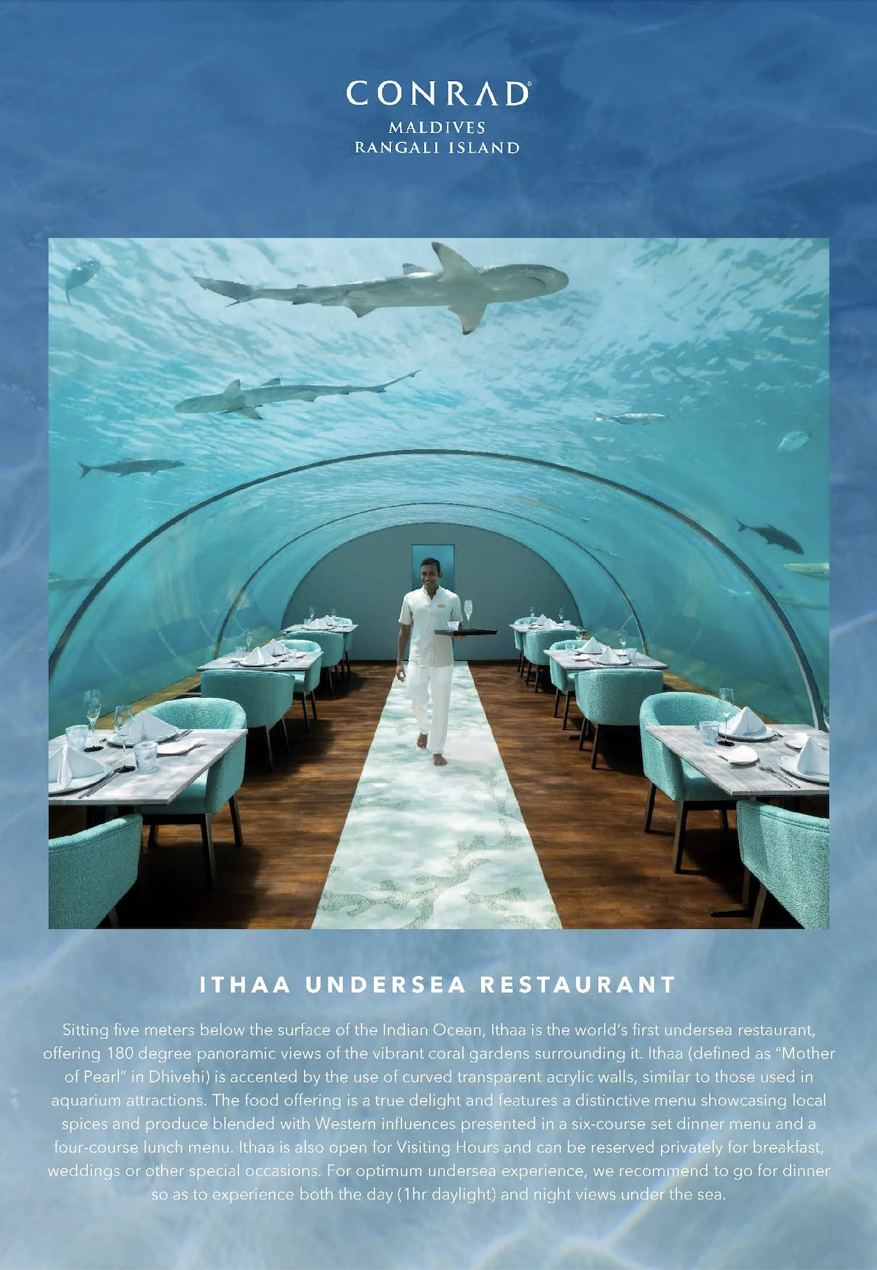 Dinner credit of USD 145.00 will apply at Ithaa, Beach BBQ, Special Wine Pairing Dinner, KOKO Grill, Wine Cellar and any other special dining event.