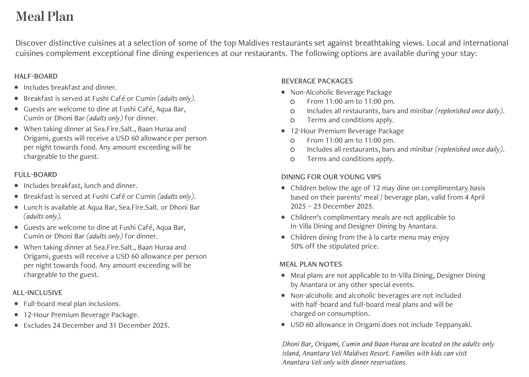 Families with children can visit Anantara Veli only with reservations after 6.30pm. Dhoni Bar is an adults only experience and no guest below the age of 18 are allowed.