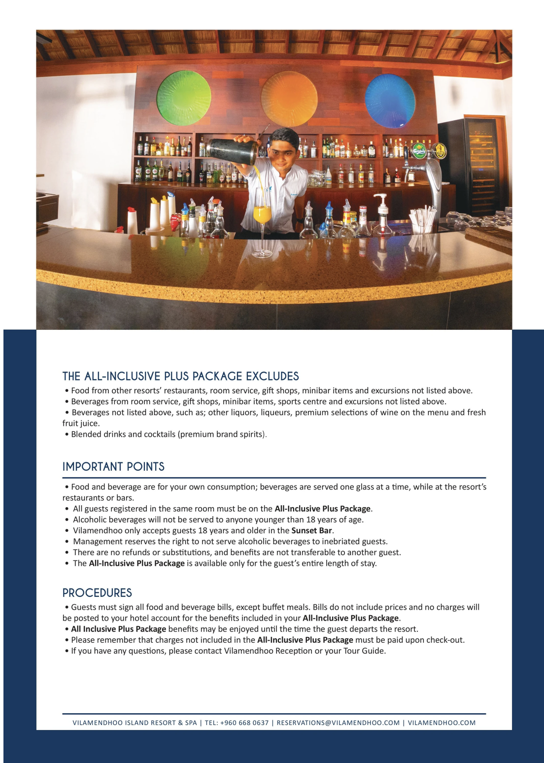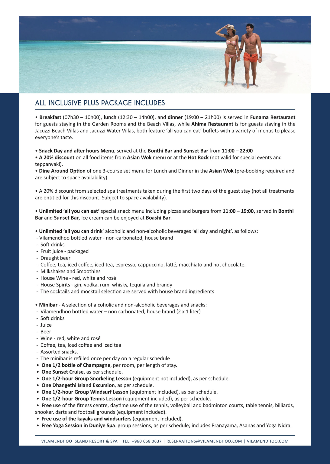 Vilamendhoo Island Resort and Spaรีสอร์ทระดับ 4 ดาวที่อยู่ในเครือเดียวกับ Meeru Island Resortตั้งอยู่ทาง South Ari Atoll ซึ่งสมบูรณ์ไปด้วยแนวประการังมากมาย เหมาะกับคนที่ชื่นชอบการ Snorkelingเพราะรอบ ๆ รีสอร์ทเต็มไปด้วยแนวปะการังที่สมบูรณ์ ให้บริการแบบAll inclusiveซึ่งจะรวมอาหารเครื่องดื่มไว้ให้บริการตลอด24 ชม. เหมาะกับนักดื่มเป็นอย่างมากค่ะ