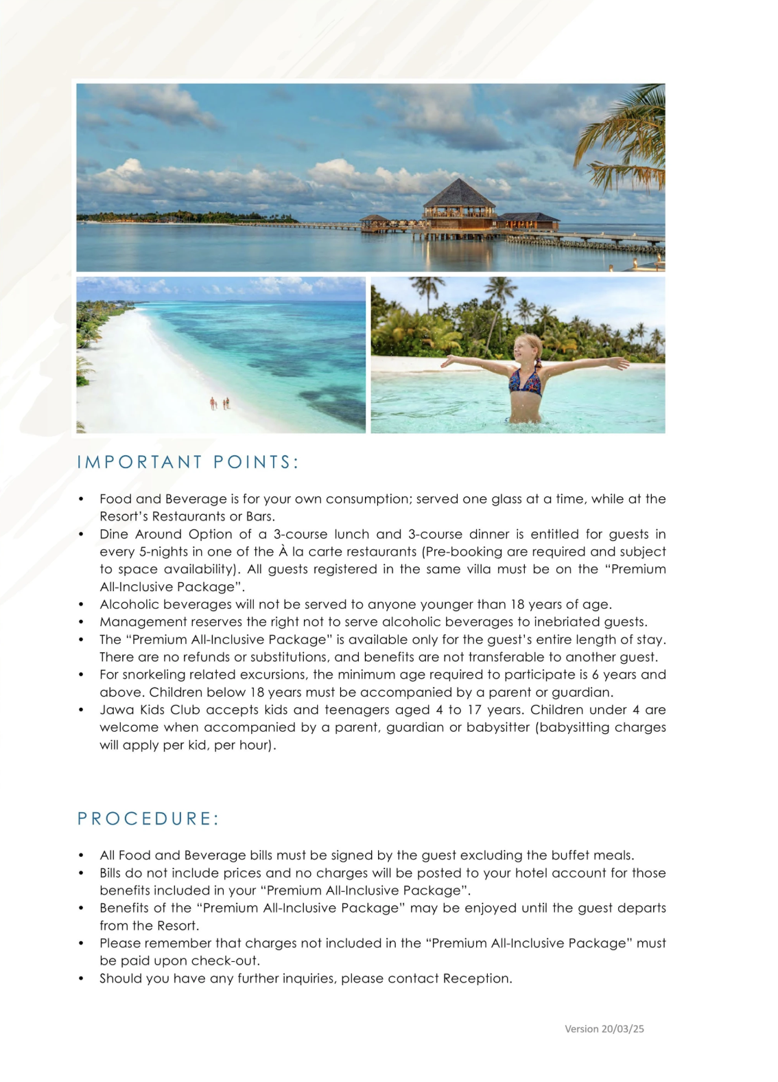 ** การให้บริการขึ้นอยู่กับตารางเวลา, ตารางกิจกรรมและสถานที่ตามกำหนดของรีสอร์ทซึ่งอาจมีการเปลี่ยนแปลงโดยไม่ได้แจ้งให้ทราบล่วงหน้า