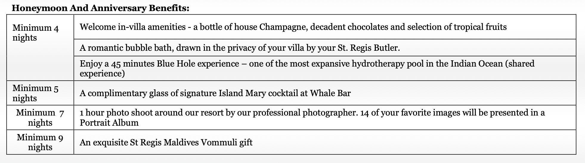 HONEYMOON AND ANNIVERSARY COMPLIMENTARY