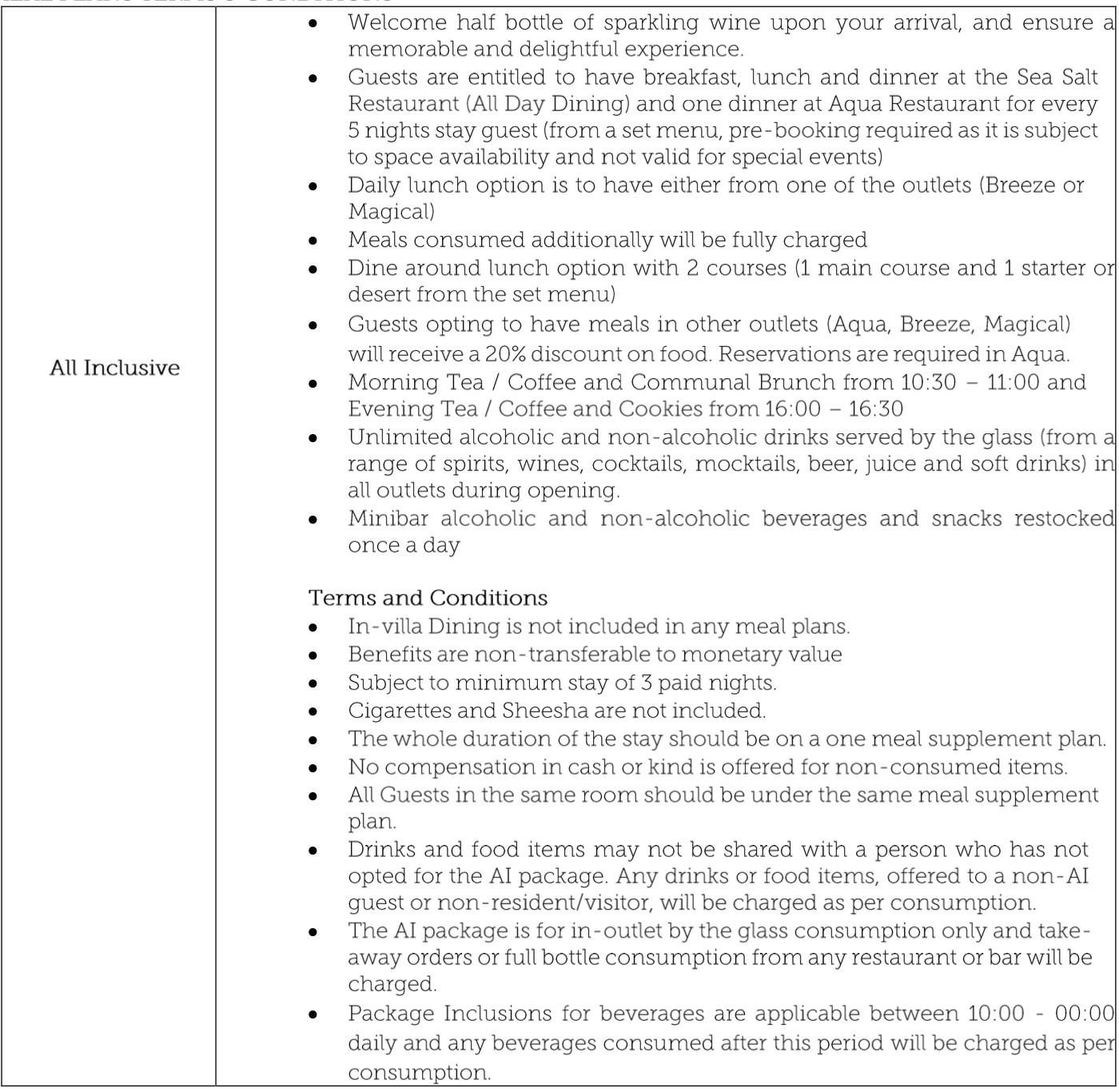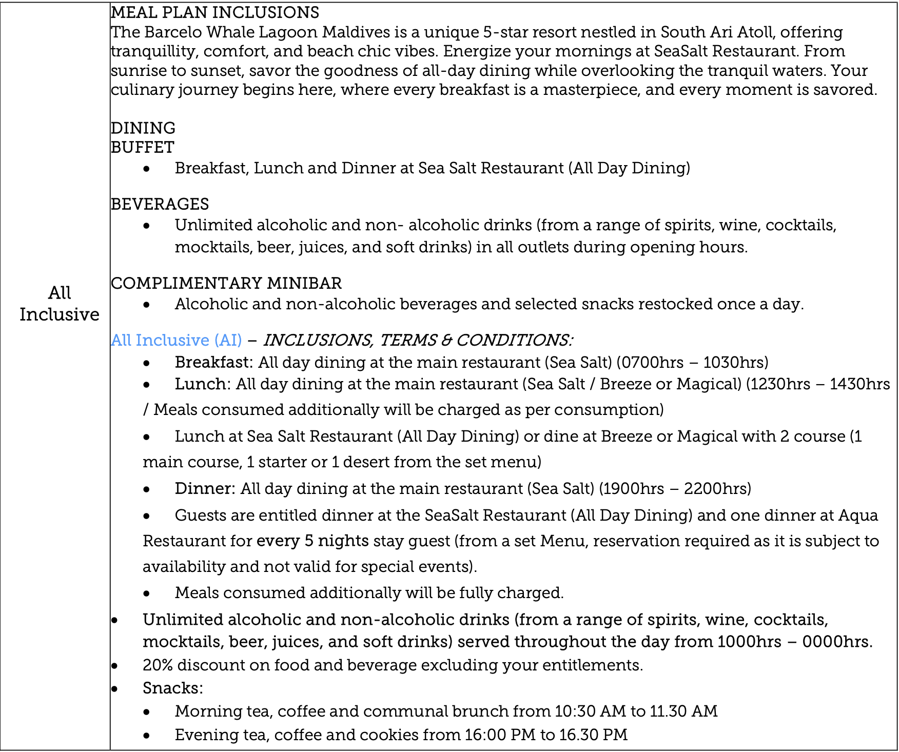• อาหารและเครื่องดื่มทุกมื้อ (รวมเครื่องดื่มที่มีและไม่มีแอลกอฮอล์) รายละเอียดด้านล่าง/ All Inclusive Meal Plan: including alcoholic & non-alcoholic beverages (Detail is below)