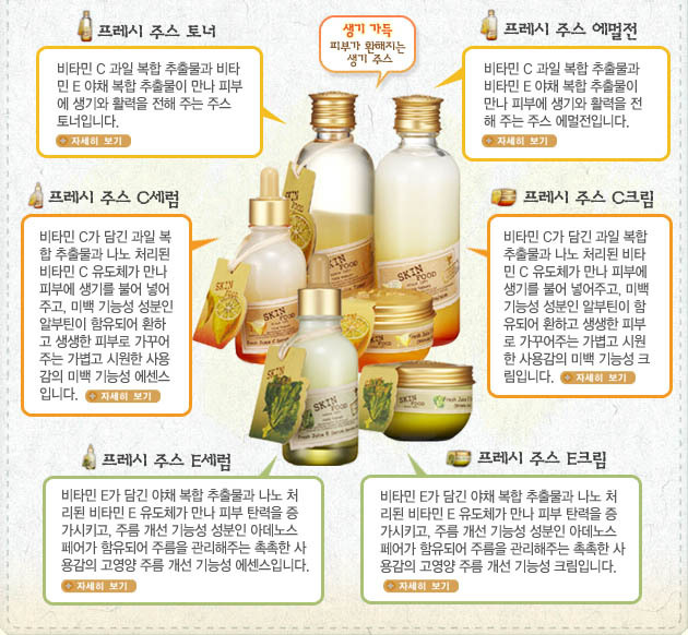 สกิน ฟูด เฟรช จูส อี ครีม ( ริงเคิล แคร์ ) สูตร Vitamin E เข้มข้น มีสารต้านอนุมูลอิสระ ป้องกันการเกิดริ้วรอยช่วยลดเลือนริ้วรอยให้ดูจางลง Adennosine ,Adenosphere ด้วยวิทยาการ Nano Liposonme Technology ซึมซาบได้ล้ำลึก