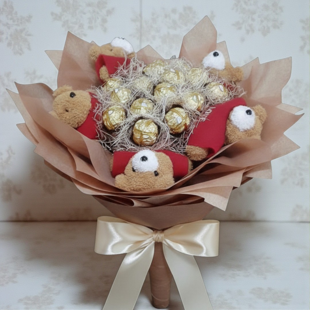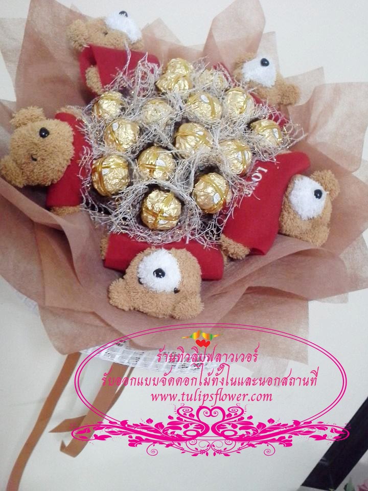 ช่อเฟอเรโร่ จำนวน 15 ลูก+ตุ๊กตา ตัวเล็กใส่เสื้อสีแดง จำนวน 5 ตั้ว
