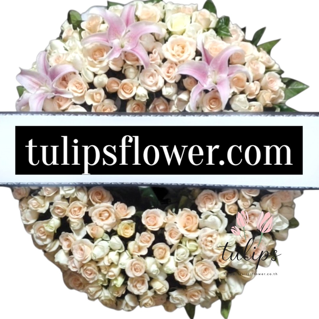 พวงหรีดดอกไม้สด โทนสีโอรส ปักด้วยดอกกุหลาบสีหวานทั้งพวง ขนาดกว้างประมาณ 36-38 นิ้ว