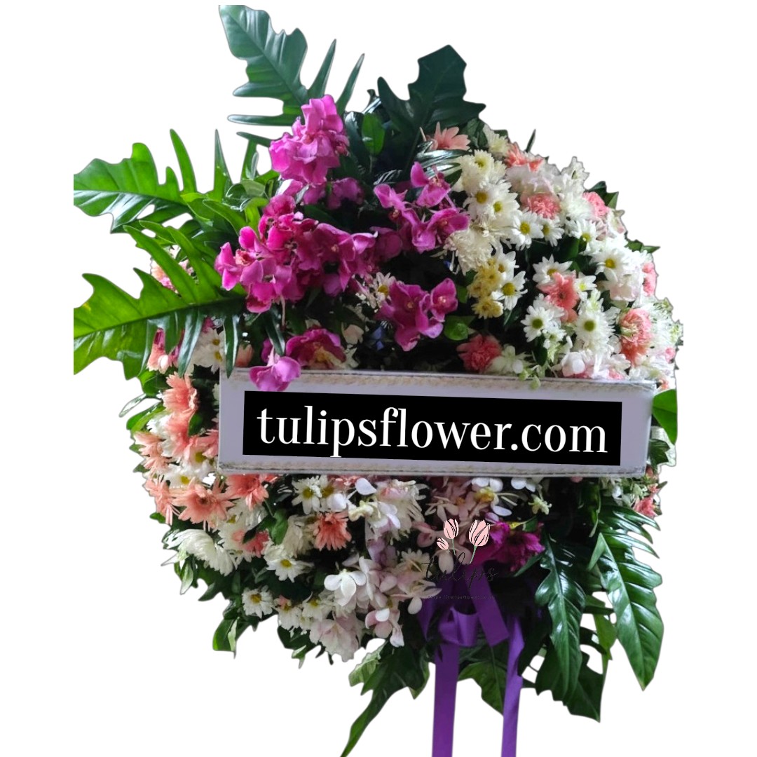 พวงหรีดดอกไม้สด โทนสีขาว ม่วง ชมพู เขียว ขนาดกว้างประมาณ 38-40 นิ้ว