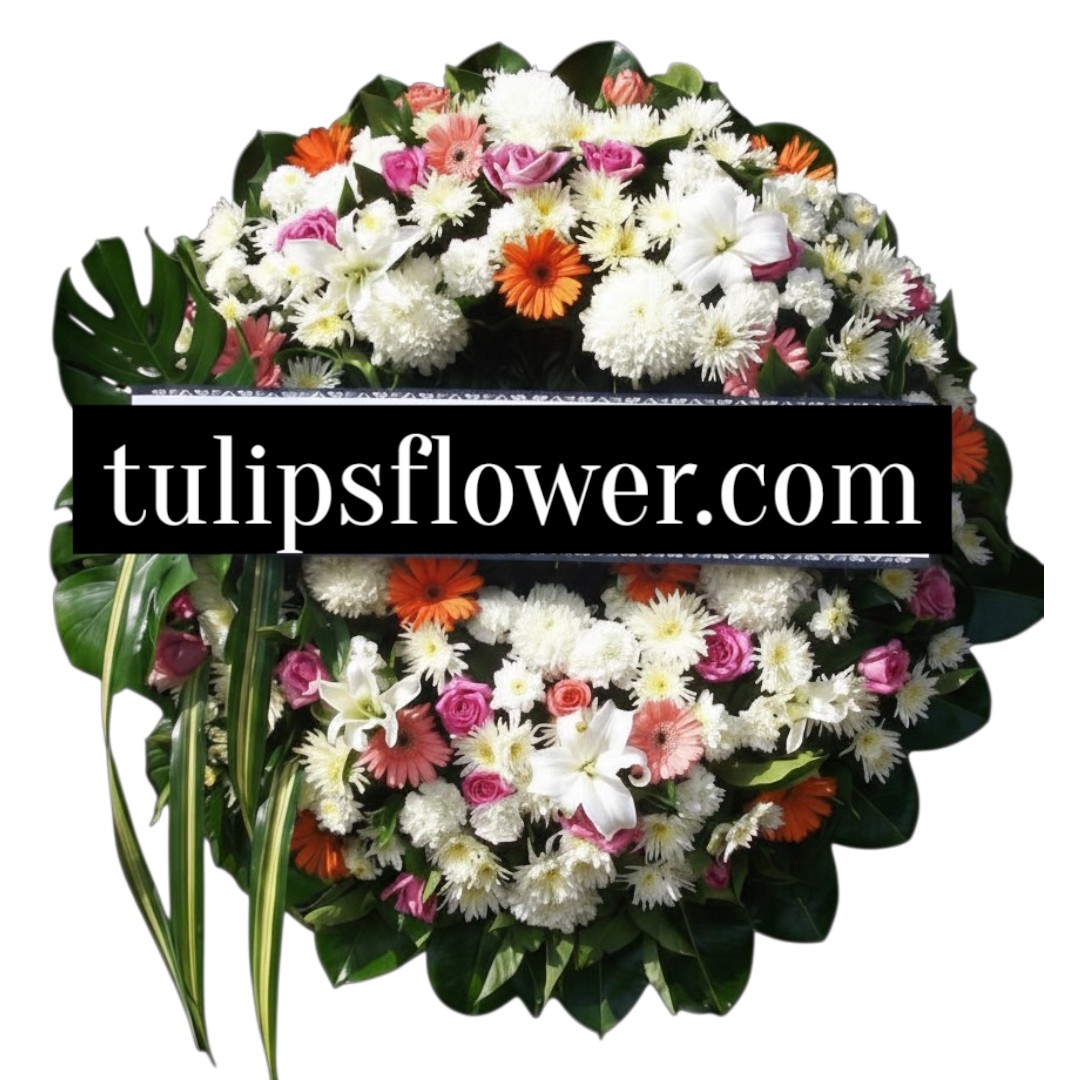 พวงหรีดดอกไม้สด โทนสีขาว แดง ม่วง ขนาดกว้างประมาณ 35-38 นิ้ว