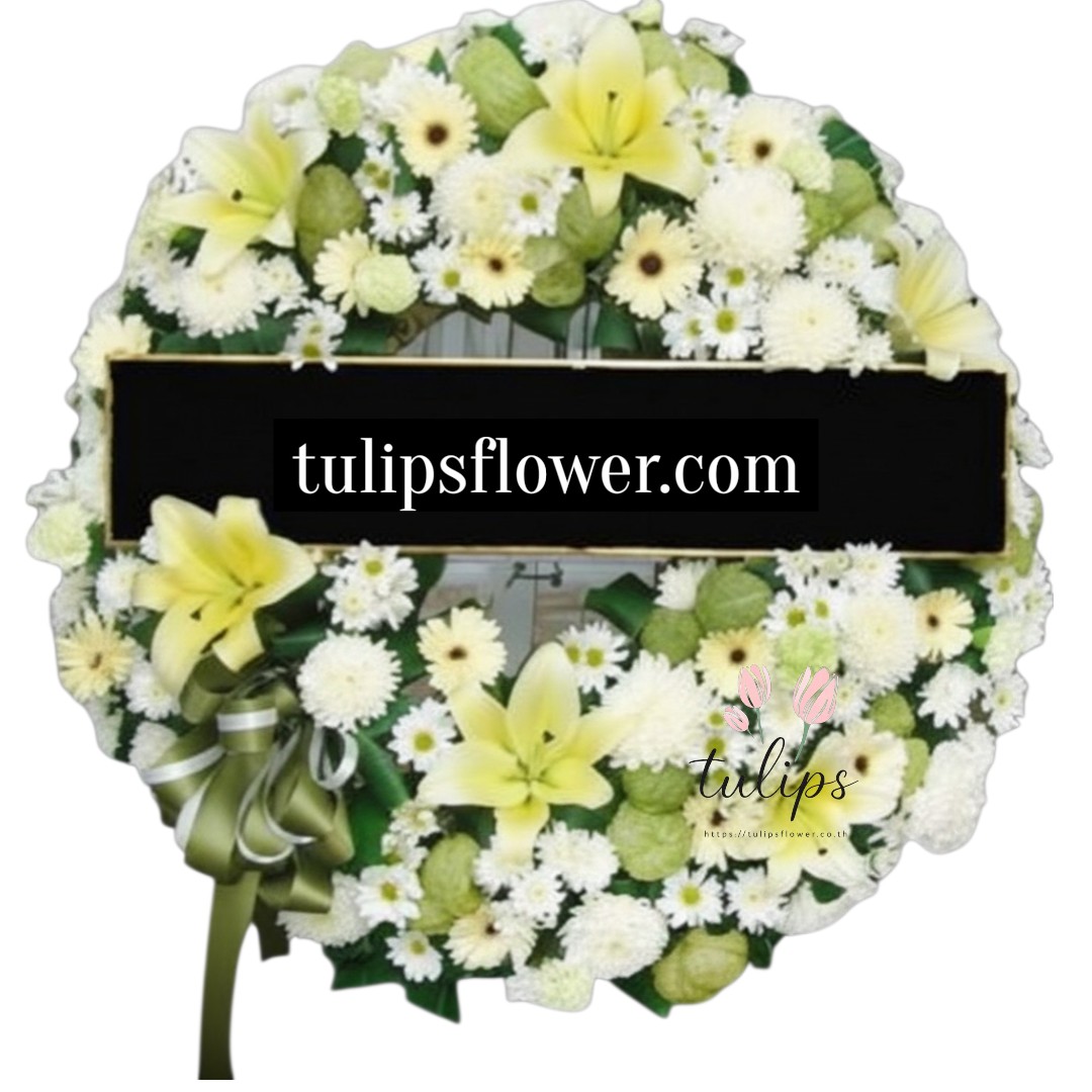 พวงหรีดดอกไม้สด โทนสีขาว เขียว เหลือง ขนาดกว้างประมาณ 35-38 นิ้ว